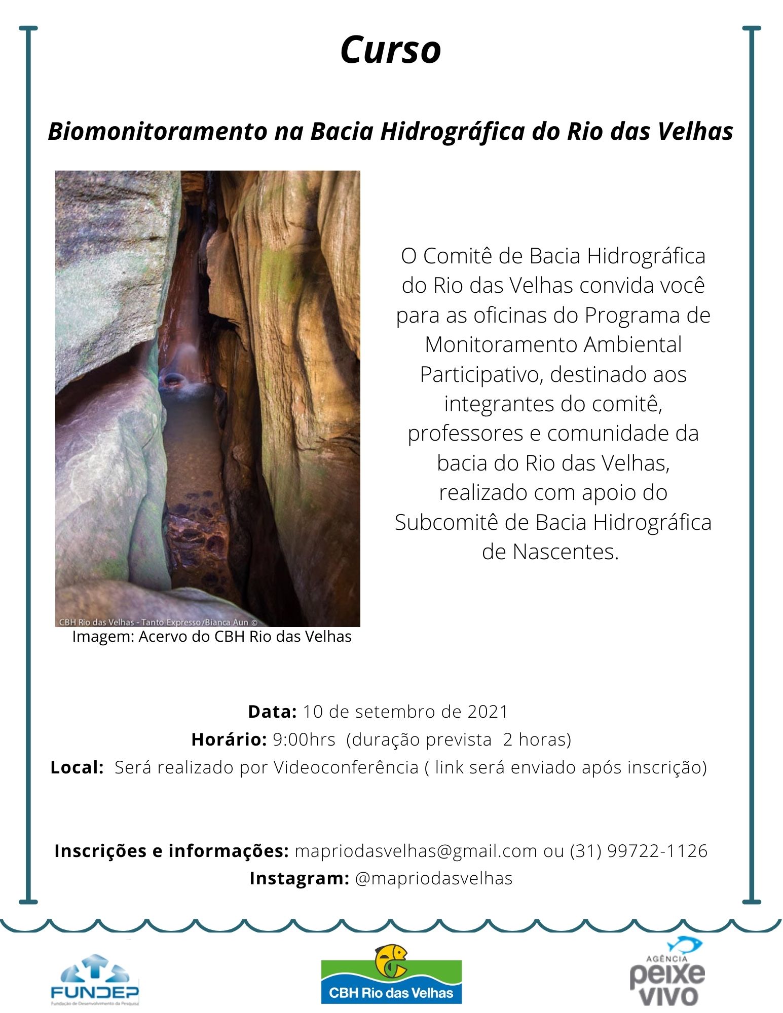 O Comitê de Bacia Hidrográfica do Rio das Velhas convida você para as oficinas do Programa de Monitoramento Ambiental Participativo, destinado aos integrantes do comitê, professores e comunidade da bacia do Rio das Velhas, realizado com apoio do Subcomitê de Bacia Hidrográfica Nascentes.