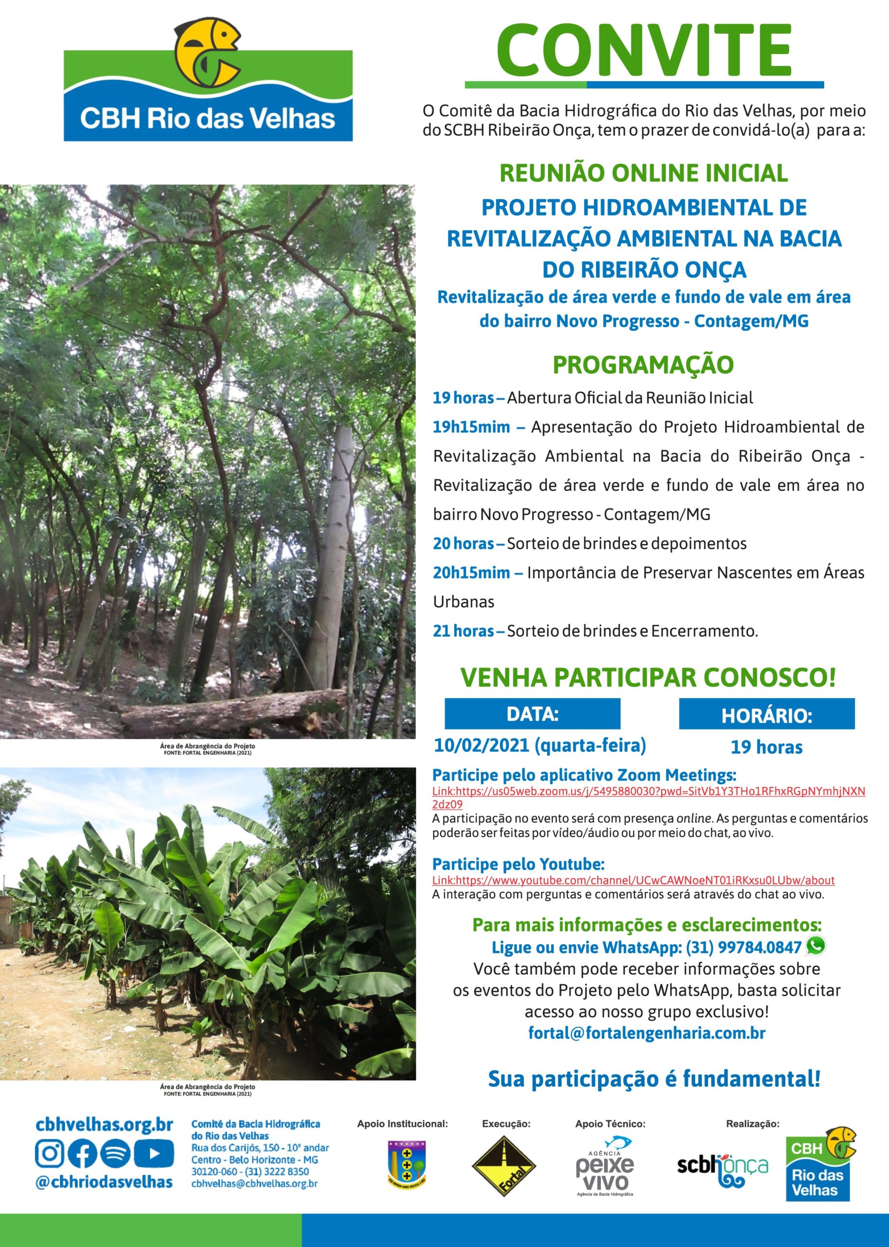 O Comitê da Bacia Hidrográfica do Rio das Velhas, por meio do SCBH Ribeirão Onça, irá realizar Reunião Inicial online do Projeto Hidroambiental de Revitalização Ambiental na Bacia do Ribeirão Onça – Revitalização de área verde e fundo de vale em área do bairro Novo Progresso, no município de Contagem – MG.