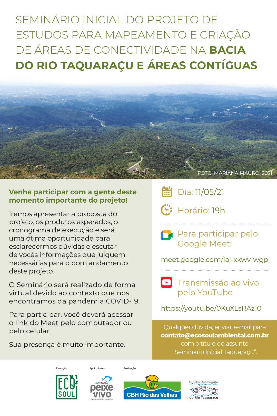 O seminário será no dia 11 de maio de 2021 (terça-feira), às 19h, que discutirá os estudos para mapeamento e criação de áreas de conectividade na Bacia do Rio Taquaraçu. O evento será realizado de forma virtual.