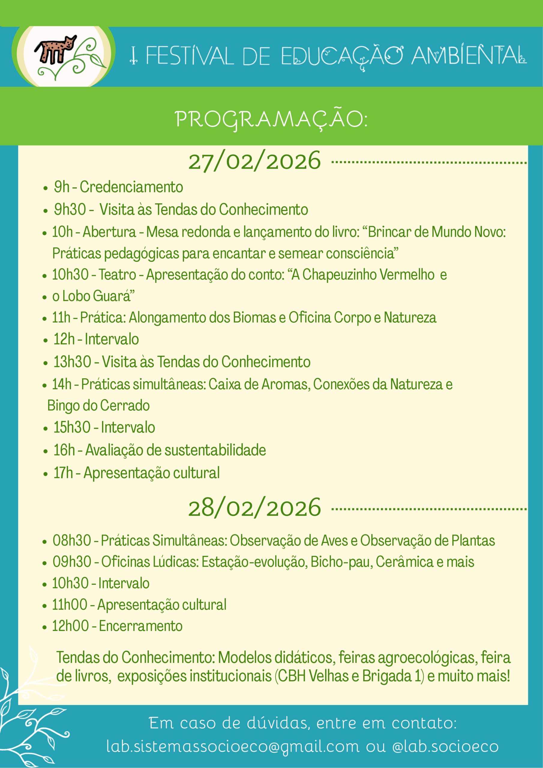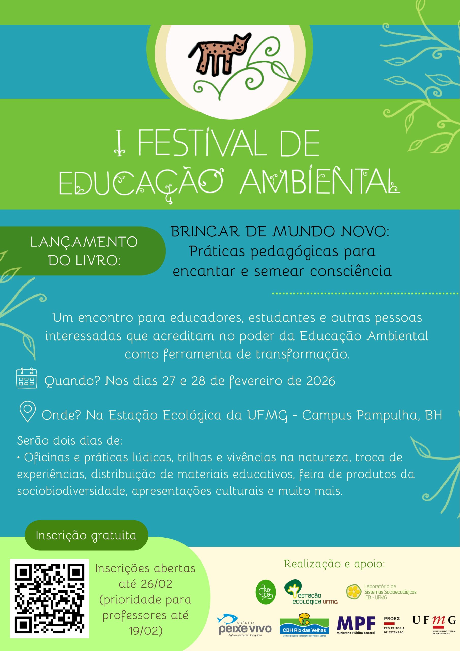 Nos dias 27 e 28 de fevereiro, o Laboratório de Sistemas Socioecológicos da Universidade Federal de Minas Gerais (UFMG) vai promover o seu I Festival de Educação Ambiental. O Comitê da Bacia Hidrográfica do Rio das Velhas (CBH Rio das Velhas) apoia o evento, que vai acontecer na Estação Ecológica da UFMG – Campus Pampulha, e estará presente com a Exposição Educativa ‘Velhas, Faço Parte’. As inscrições estão abertas até o próximo dia 26, por meio do preenchimento de formulário eletrônico.