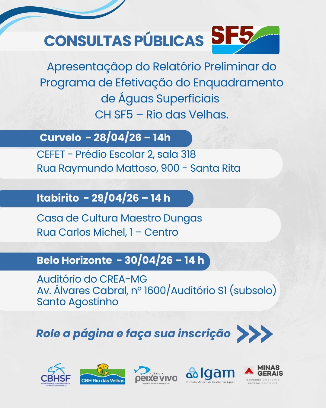 A participação da sociedade será peça-chave nas próximas etapas de planejamento da gestão hídrica na bacia do Rio das Velhas. O Comitê da Bacia Hidrográfica do Rio das Velhas (CBH Rio das Velhas) promove, nos dias 28, 29 e 30 de abril, consultas públicas para apresentar o Relatório Preliminar do Programa de Efetivação do Enquadramento de Águas Superficiais do território.