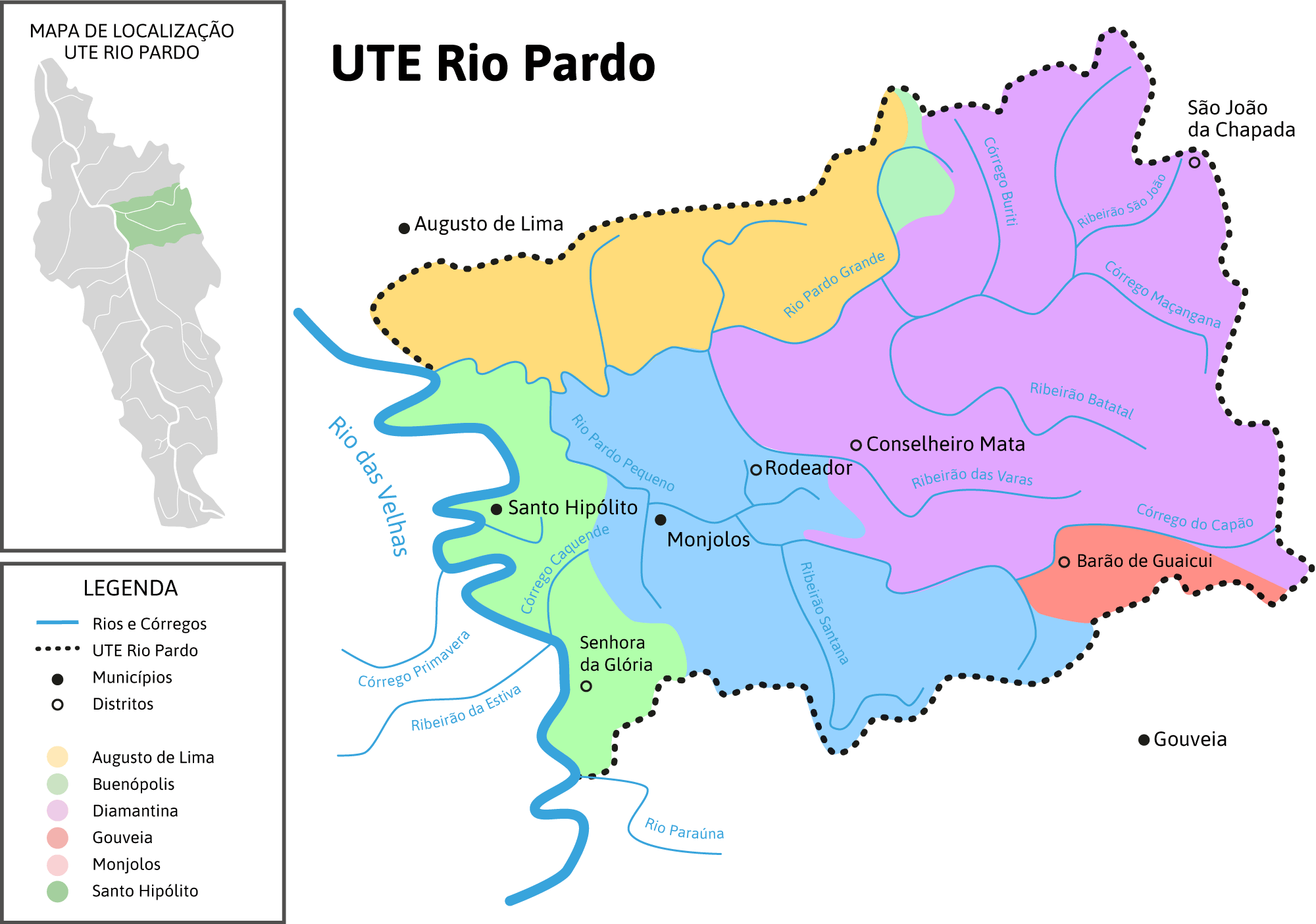 Tendo como principais afluentes o Rio Pardo Pequeno e o Ribeirão das Varas, a sub-bacia do Rio Pardo drena parte do território dos municípios de Augusto de Lima, Buenópolis, Diamantina, Gouveia, Monjolos e Santo Hipólito. Na região, os Rios Pardo e Pardo Pequeno são conhecidos como Pardão e Pardinho.