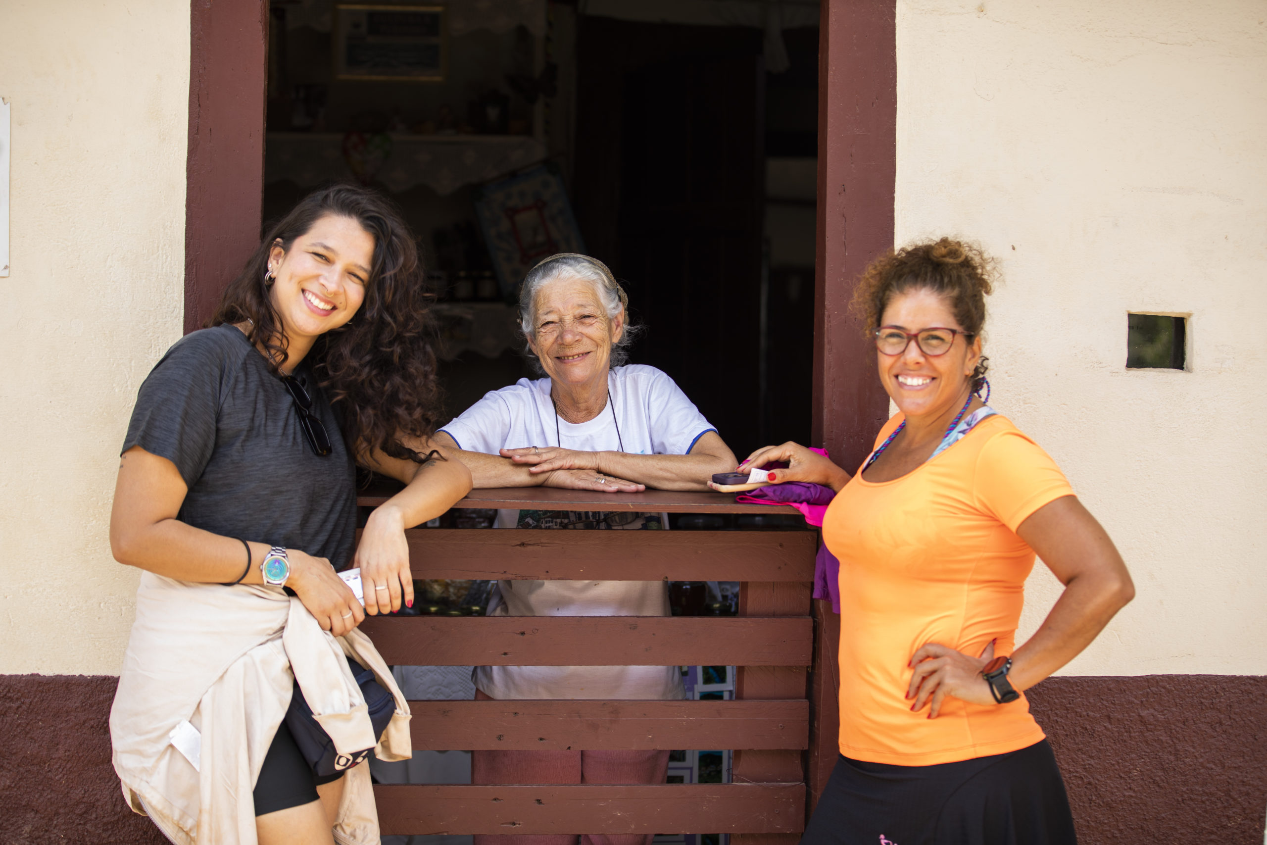 Produtora Luciana Machado (dir.) e a repórter Giovanna Pires (esq.) junto a moradora local, durante a produção desta reportagem. Ao lado, as águas cristalinas do Parque das Andorinhas, berço do Rio das Velhas