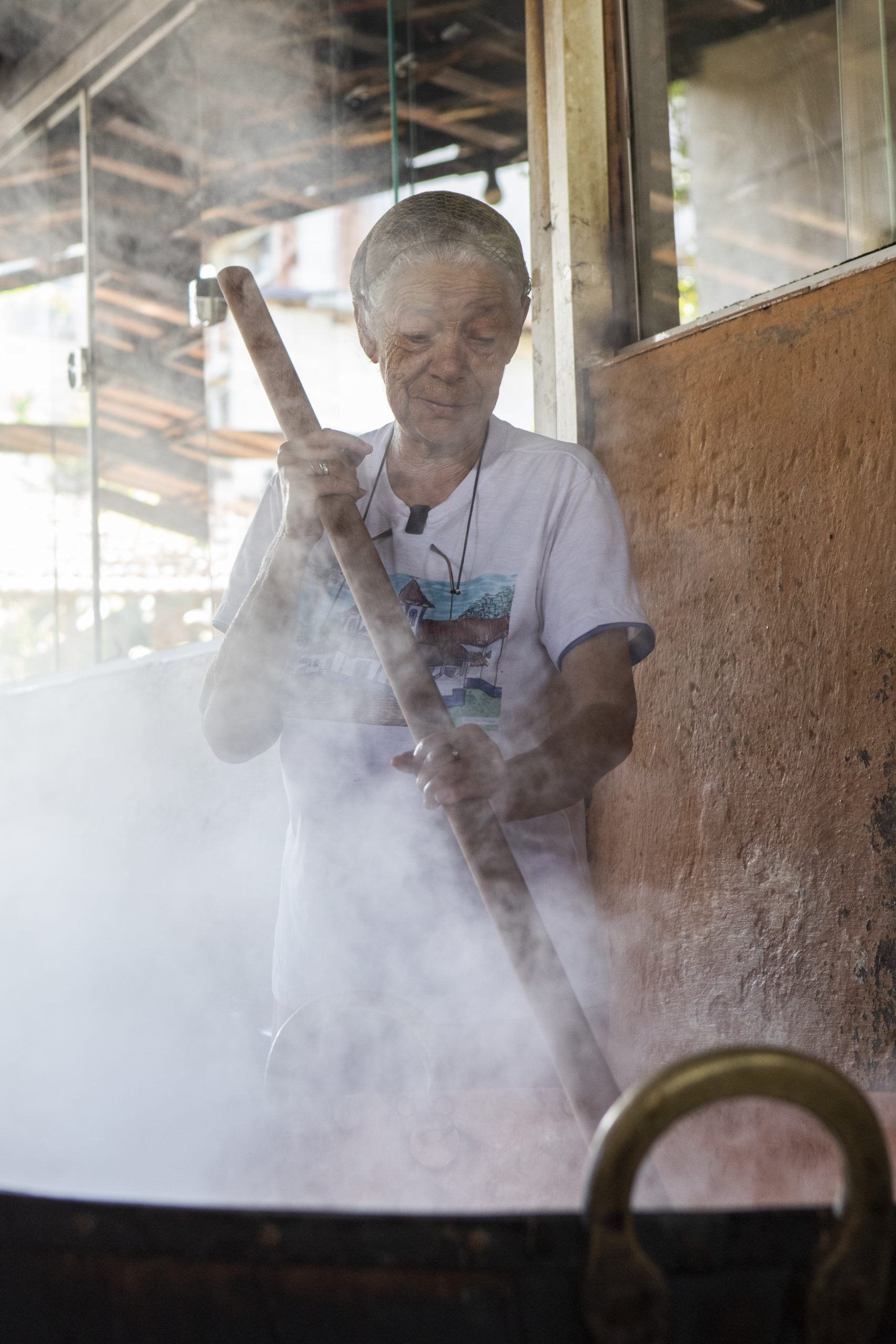 A igreja fica na rua principal do distrito, onde mora uma família que está há séculos no povoado e que vive de fazer doces. A família de Serma Fortes, 76 anos, aprendeu a arte dos doces artesanais em tacho de cobre, uma tradição que atravessou gerações. O carro-chefe é a goiabada cascão, mas também tem geleias de frutas, doce de leite, raspas de laranja com chocolate… Atualmente, quem produz os doces é o neto Filipe Fortes. É dele a força de mexer a colher de pau e deixar o doce no ponto. “Quando meus avós não estavam dando conta de produzir mais a quantidade de doce que a gente sempre produziu, minha mãe veio para cá para ajudá-los e eu vim morar aqui também. E hoje já tem cinco anos que eu produzo doce aqui com eles”, contou Filipe.