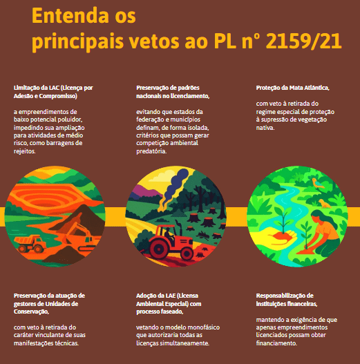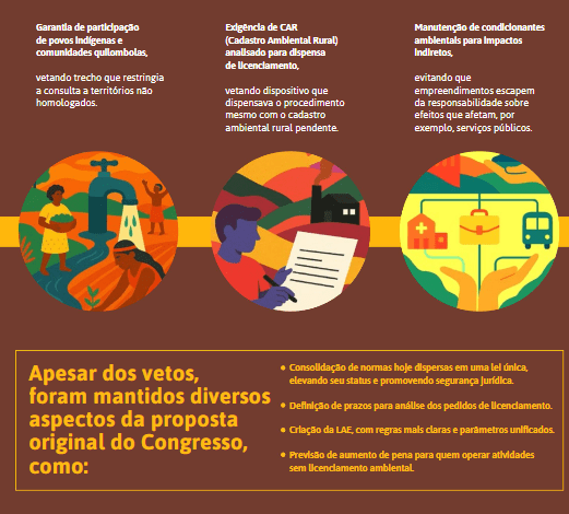 O presidente Luiz Inácio Lula da Silva (PT) sancionou com vetos, no dia 8 de agosto, o projeto de lei aprovado no Congresso que fragiliza regras para o licenciamento ambiental. Dos quase 400 dispositivos da lei que receberam aval no Legislativo, o presidente vetou 63, evitando a implementação da licença automática, reforçando a proteção de áreas sensíveis e garantindo a exigência de estudos de impacto ambiental para projetos prioritários.
