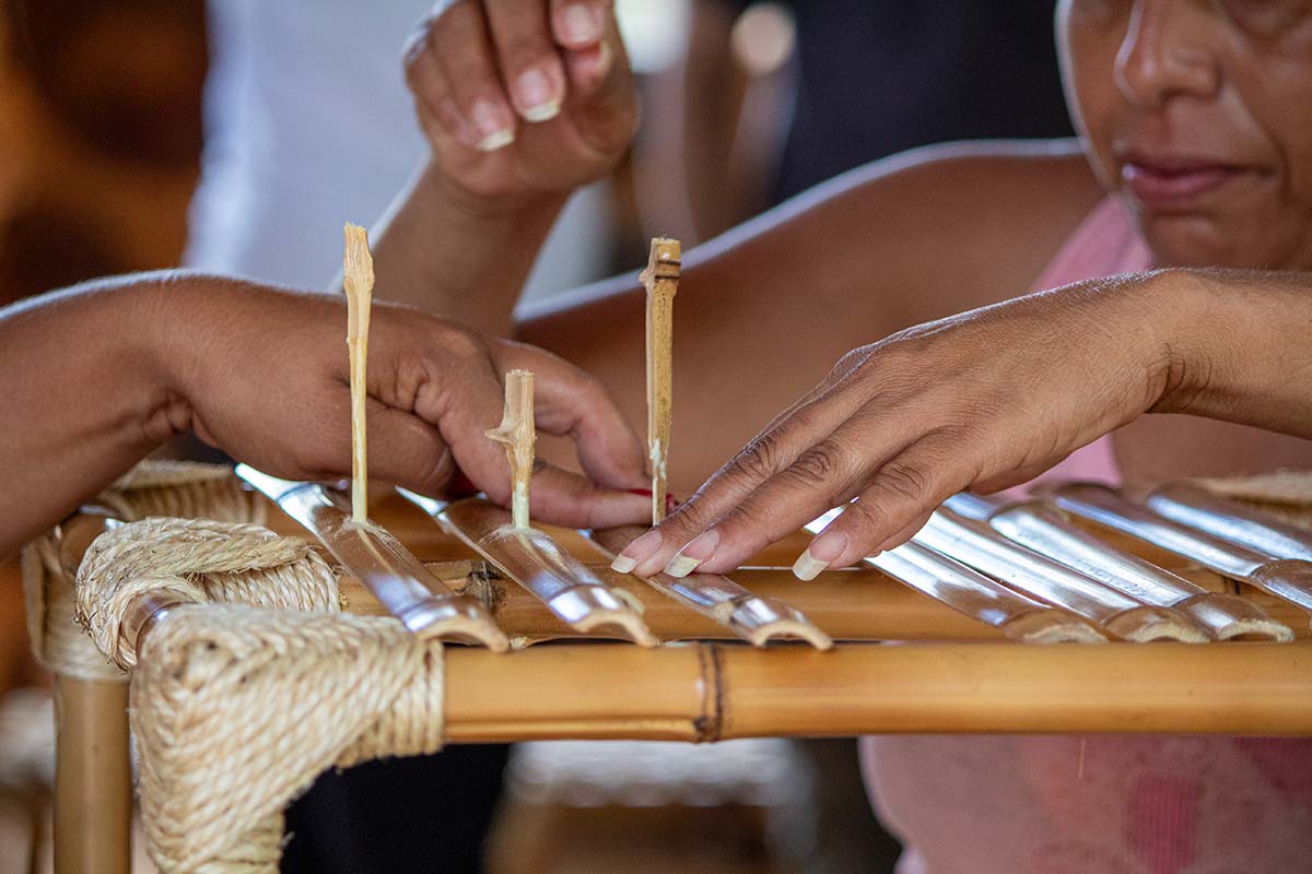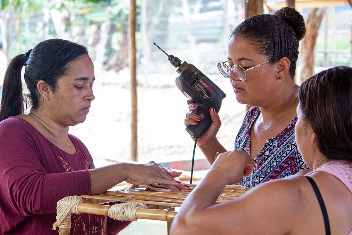 Diante da estruturação do TBC, uma outra organização comunitária ganhou força: o Coletivo de Mulheres de Extrema. A educadora e participante do coletivo Beatriz Gama contou que o movimento começou em 2020 com o objetivo de trocar saberes e gerar renda para a comunidade. Durante esse período, oficinas em diversas áreas foram realizadas para que todas pudessem conhecer e se identificar com alguma técnica. “Tivemos um curso sobre placas entalhadas e móveis de bambu, e essa foi uma das técnicas que elas mais se identificaram, tanto que hoje é o que elas mais produzem”, explicou Gama.
