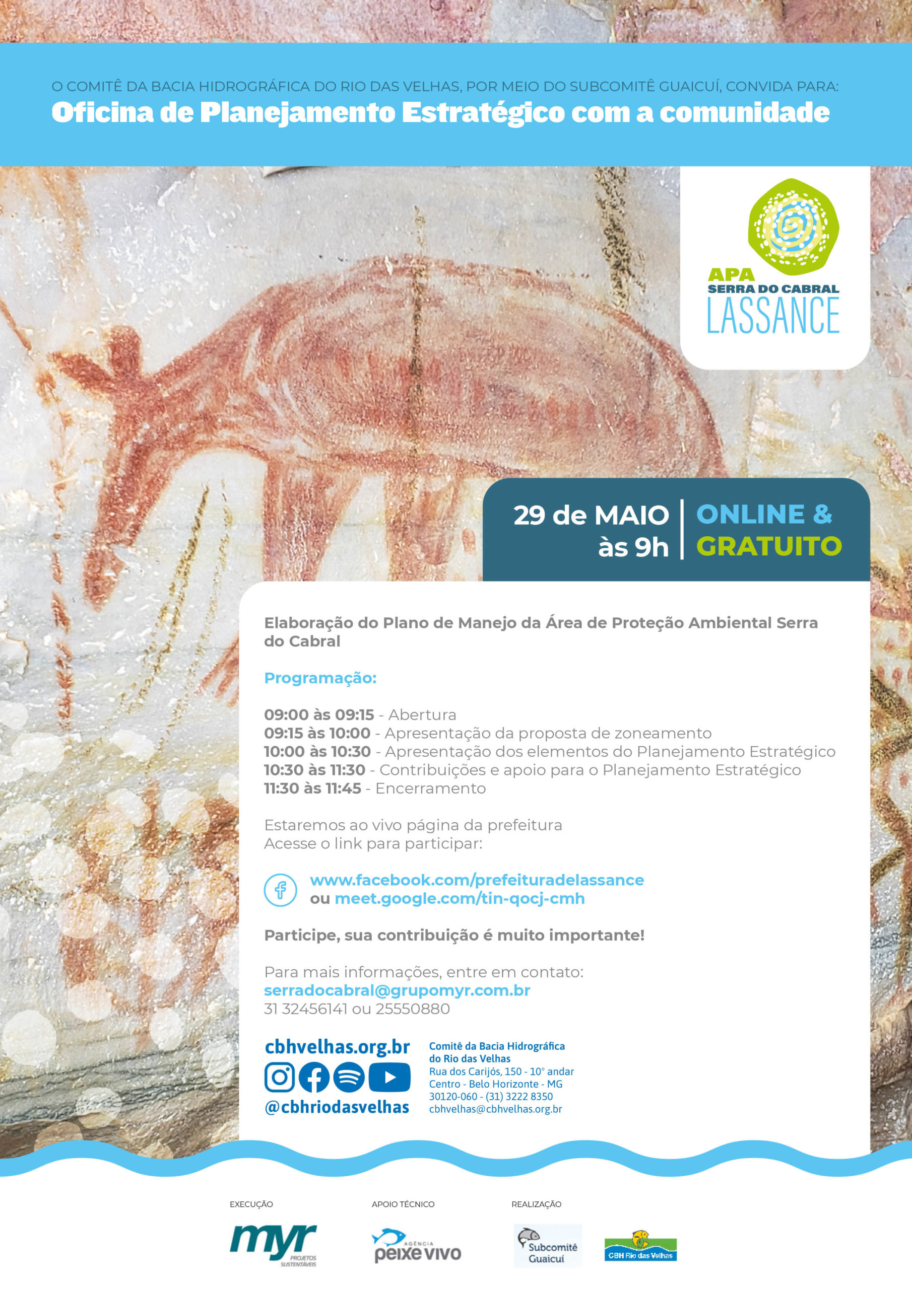 O Comitê da Bacia Hidrográfica do Rio das Velhas (CBH Rio das Velhas) e o Subcomitê Guaicuí convidam a todos para as Oficinas de Planejamento Estratégico da Área de Proteção Ambiental (APA) da Serra do Cabral. Serão dois encontros, voltados aos municípios de Lassance e Várzea da Palma, que terão o objetivo de receber contribuições para a construção do planejamento estratégico e do zoneamento da região.
