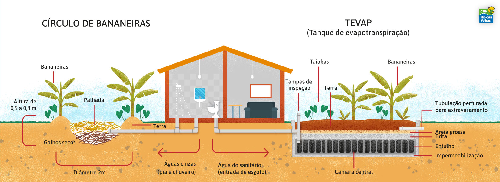 O projeto prevê colocar em prática dois tipos de tecnologias já conhecidas. Uma é o círculo de bananeiras, que trata das águas usadas dentro das casas, como em pias, tanques e chuveiros, as chamadas águas cinzas, e envolve o custo médio de R$ 100 reais por círculo. A outra é o tanque de evapotranspiração (TEvap), com custo médio de R$ 1 mil, o sistema que pode ser construído utilizando materiais de construção civil e pneus para tratar a água dos sanitários. Cada uma das tecnologias pode atender uma família de até 5 pessoas.