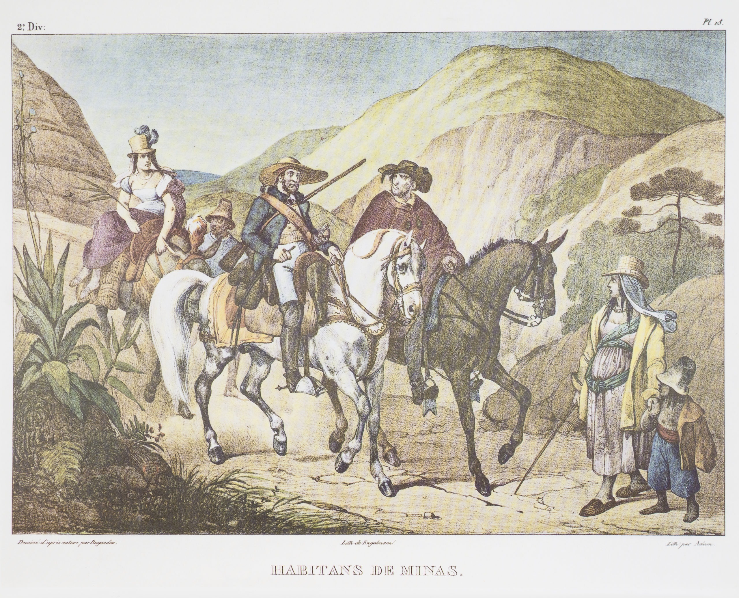 O Barão de Langsdorff apresentou o projeto ao Czar Alexandre I, montou sua equipe e partiu em expedição. À direita, a gravura de Johann Motiyz Rugendas, ‘Habitantes de Minas Gerais, datada entre 1822 e 1825, como parte de seu livro ‘Viagem Pitoresca Através do Brasil’