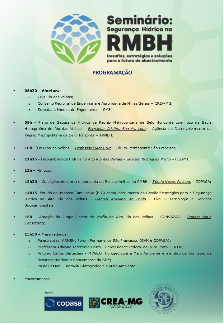 Sociedade Mineira de Engenheiros – SME. - 09h – Plano de Segurança Hídrica da Região Metropolitana de Belo Horizonte com foco na Bacia Hidrográfica do Rio das Velhas – Fernanda Cristina Ferreira Lobo – Agência de Desenvolvimento da Região Metropolitana de Belo Horizonte – ARMBH;