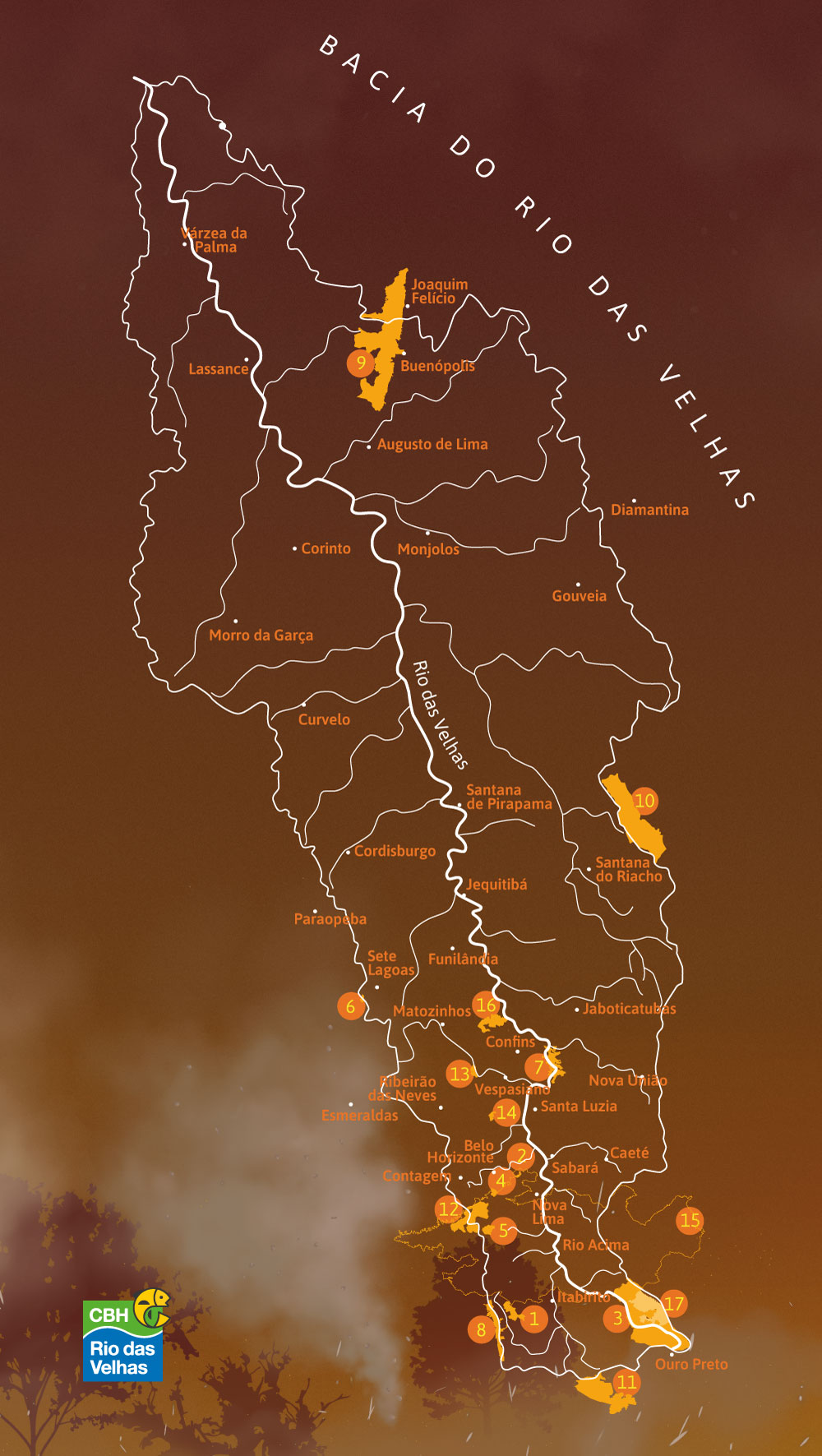 Além das unidades de conservação estaduais, os dois Parques Nacionais inseridos na bacia também sofreram. Na Serra do Cipó, foram dez dias de combates ininterruptos que mobilizaram mais de 100 profissionais, segundo o Corpo de Bombeiros, além de brigadistas do IEF, brigadistas voluntários e de empresas.